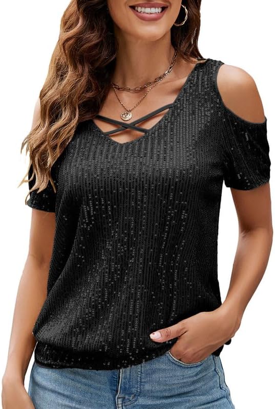Womens Sequin Tops Cross&V-Neck Cold Shoulder Tops Evening Tops Ladies Going Out