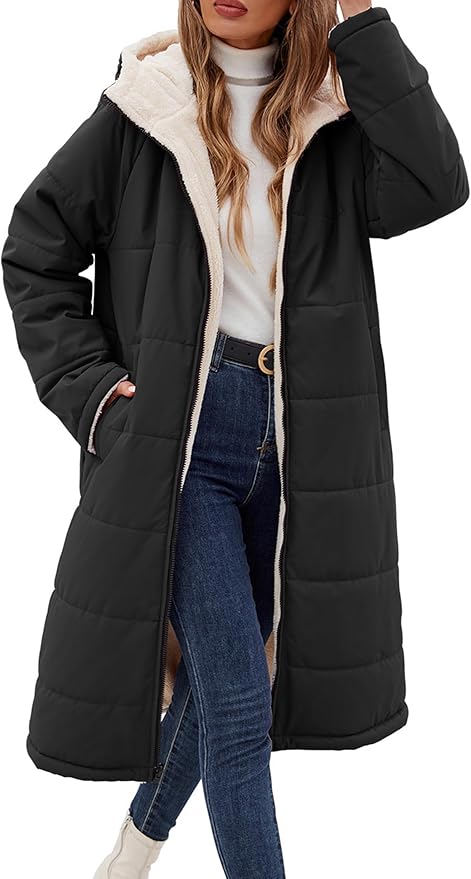 Long Winter Jackets Fleece Puffer Coat Warm Fleece Lined Thick Overcoat Full Zip Hooded Reversible Outerwear