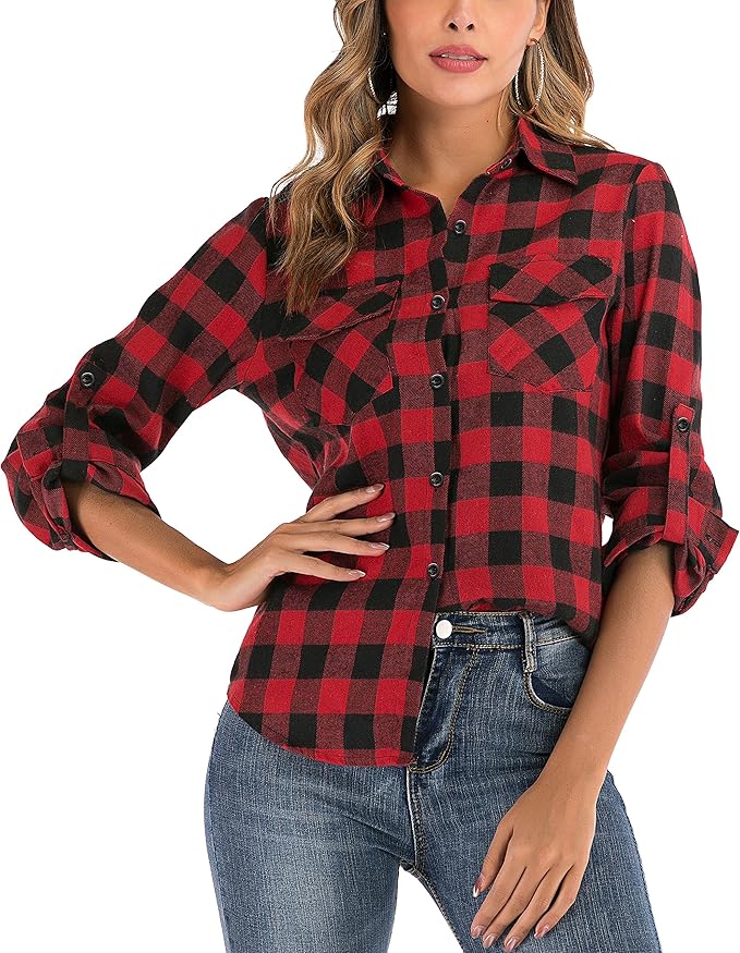 100% Cotton Women Flannel Plaid Shirt Blouse Long Sleeve