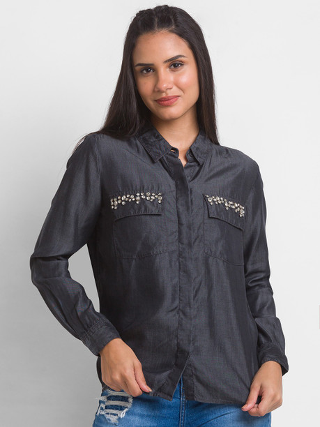 Women Regular Fit Solid Spread Collar Casual Shirt