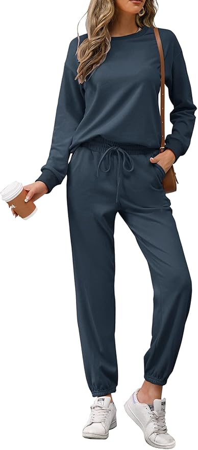 Womens Long Sleeve Crewneck Solid Color Two Piece Outfit Hoodie Jogger Tracksuit Set Sweatshirt & Sweatpants
