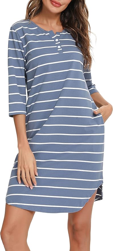 Women’s Nightdresses Soft Cotton Nightshirt Stripe 3/4 Sleeve Sleep Dress Sleepwear with Pockets