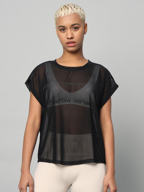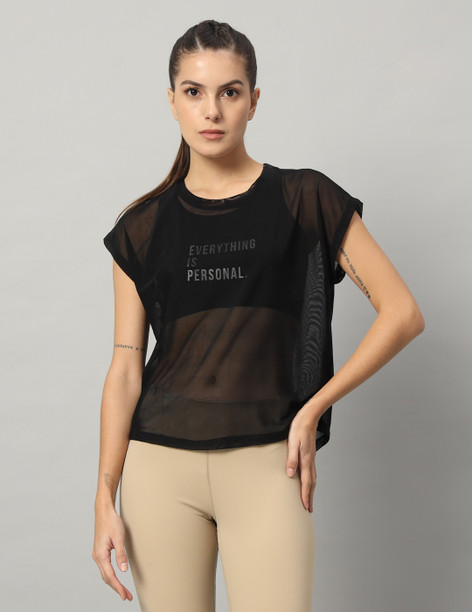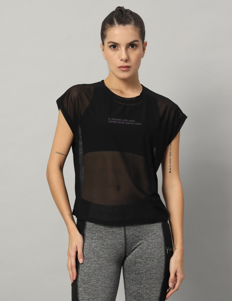 Women Typography Crew Neck Nylon Black T-Shirt