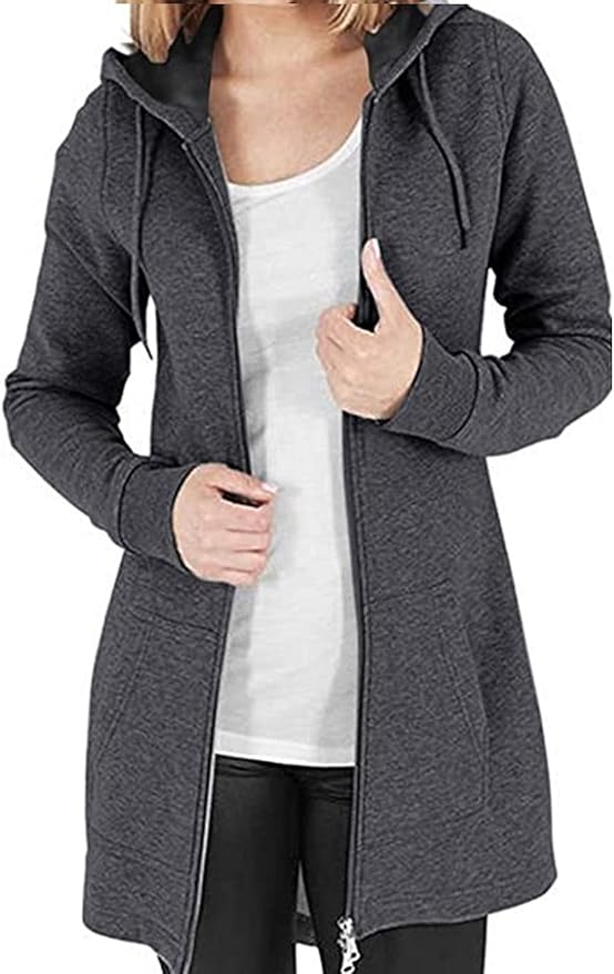 Ladies Fleece Longline Hoodie Sweatshirts Casual Loose Hooded Coat Zipper Plus Size Tops Pullover Jacket with Pockets