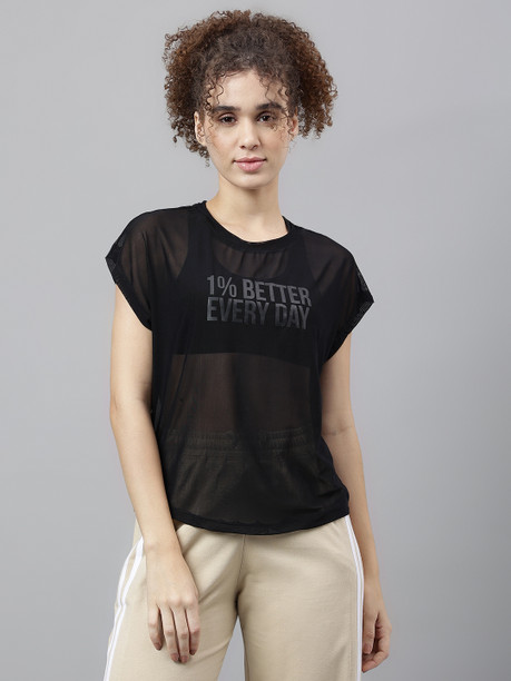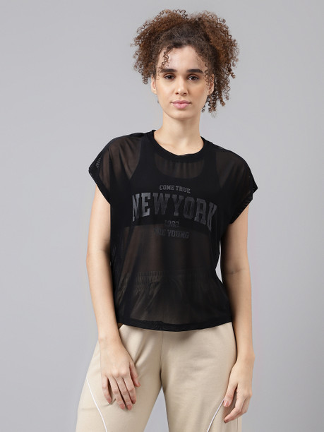 Women Typography Crew Neck Nylon Black T-Shirt